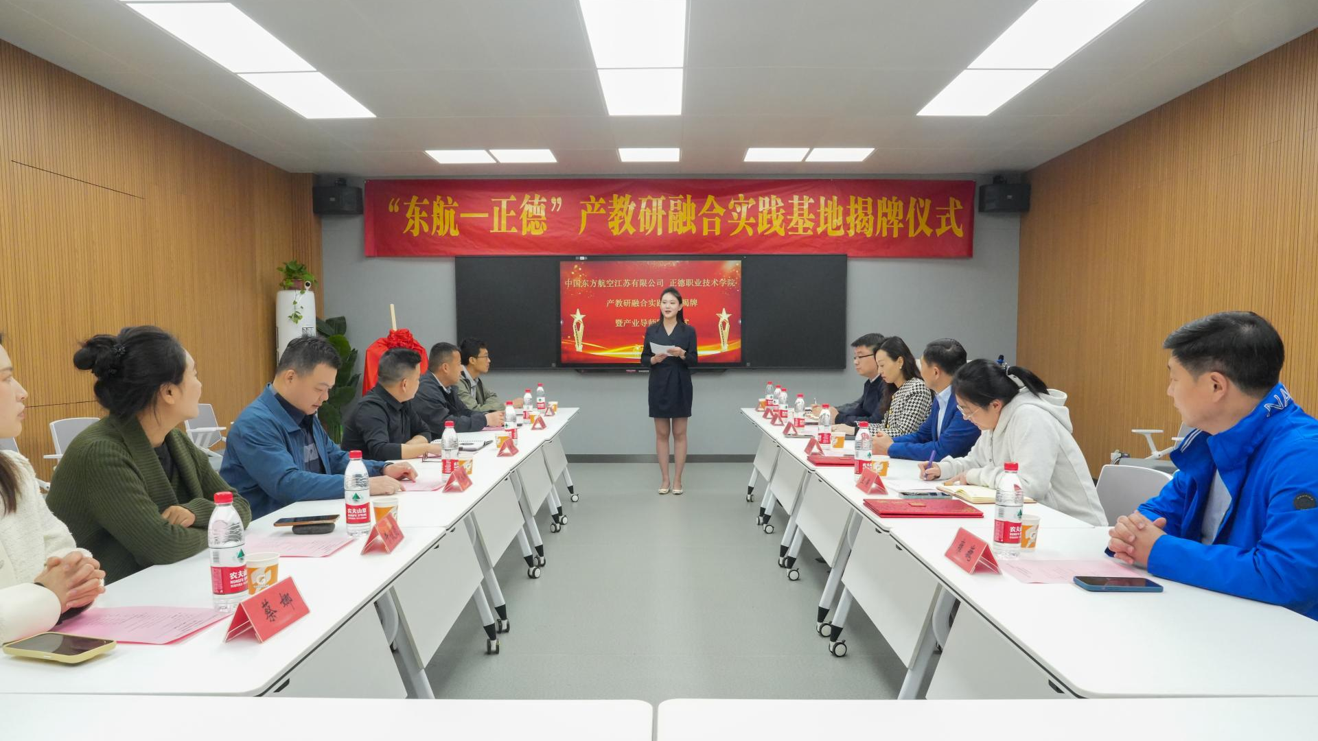 为深入贯彻职业教育改革精神,促进产教深度融合,提升民航类技能型人才培养质量,4月17日下午,51猎奇 与东航江苏公司联合共建的“东航-正德”产教研融合实践基地揭牌仪式在9106教室隆重举行。副院长江爱华、教务处处长王燕,东航江苏公司培训中心总经理胡平、办公室主任仇水峰,51猎奇 主任吴慧、专业教师代表等参加了此次活动。