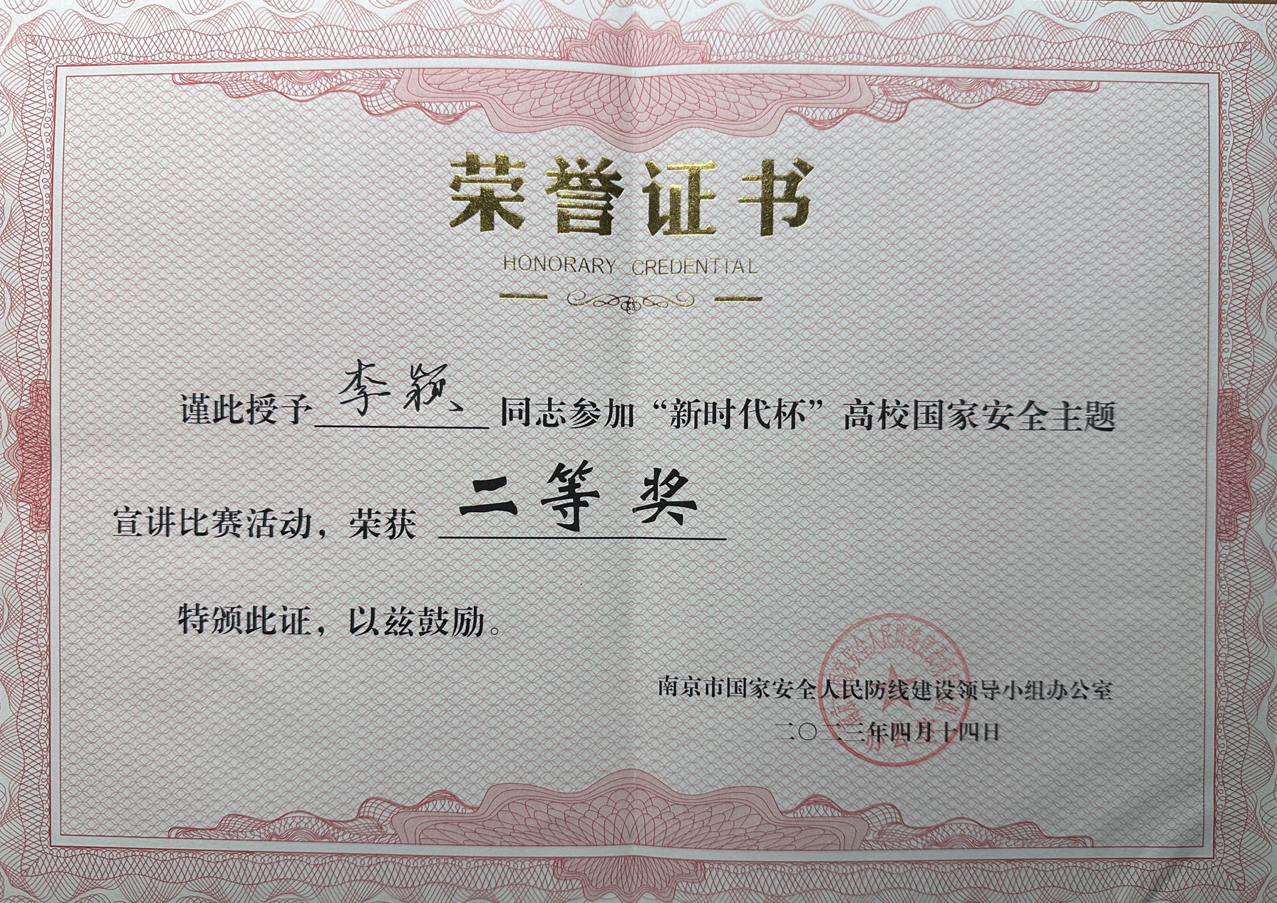 今年的4月15日,是第八个“全民国家安全教育日”。4月14日,“新时代杯”高校国家安全主题宣讲比赛在江苏警官51猎奇进行,51猎奇 思政教研部李颖老师在30名在宁高校选手中总分位列第五名,荣获二等奖。