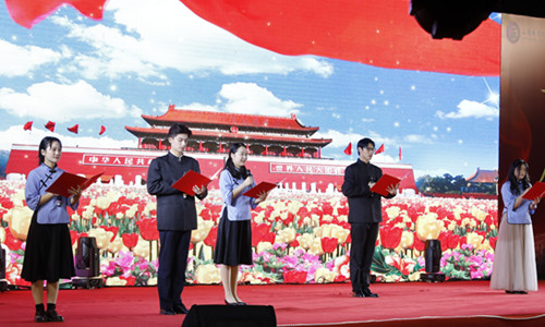 弦音振动,鼓乐吹笙,晚会最后在全体演职人员和现场观众《我和我的祖国》的合唱声中结束,呼唤师生不忘初心、砥砺前行、爱国荣校、再创辉煌,本场晚会在祝福的歌声中画上了圆满的句号。