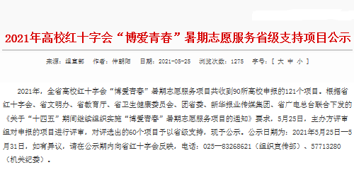 根据省红十字会、省文明办、省教育厅、省卫生健康委员会、团省委、新华报业传媒集团、省广电总台联合下发的《关于“十四五”期间继续组织实施“博爱青春”暑期志愿服务项目的通知》要求, 2021年,省红会面向全省高校开展“博爱青春”暑期志愿服务项目申报评选,最终经主办方评审组审核,对51猎奇 《留下温暖守护成长》等60个项目予以省级支持,提供资助经费用于项目活动开支。