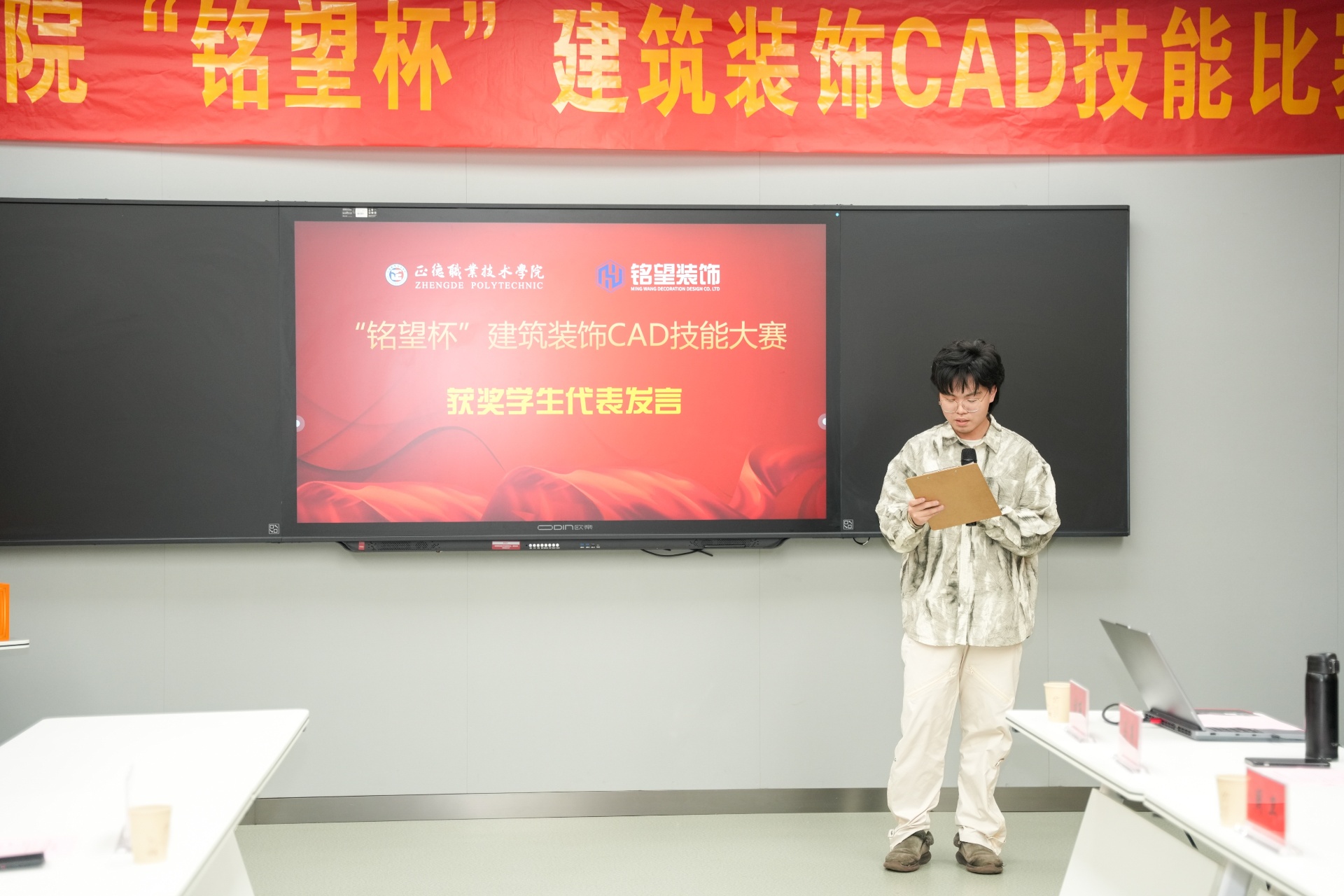 2023级建筑室内设计专业的李成翰同学作为获奖学生代表发表感言,他觉得通过参加本次大赛,不仅锻炼了自己的实践操作能力,还深刻体会到了团队合作的重要性。同时他也表示在未来的求学道路上,将更加严格要求自己,不断提升自己的专业技能和综合素质,为未来的职业生涯打下坚实的基础。