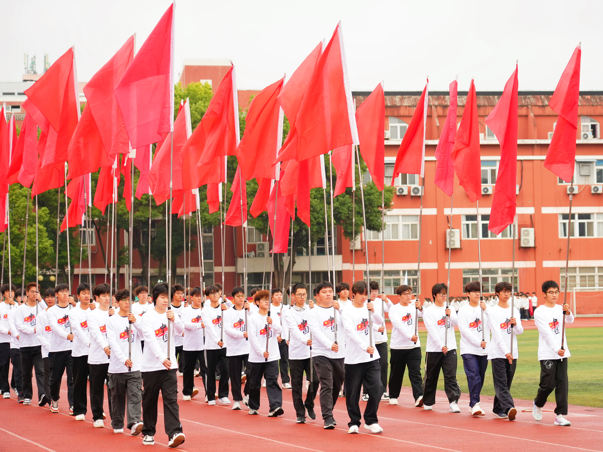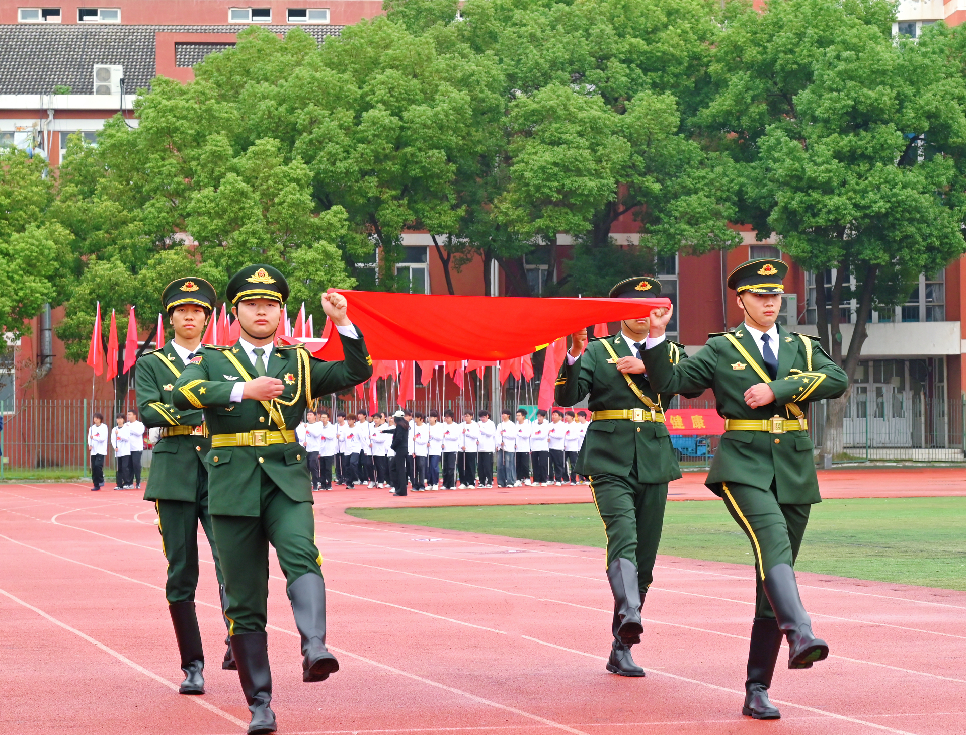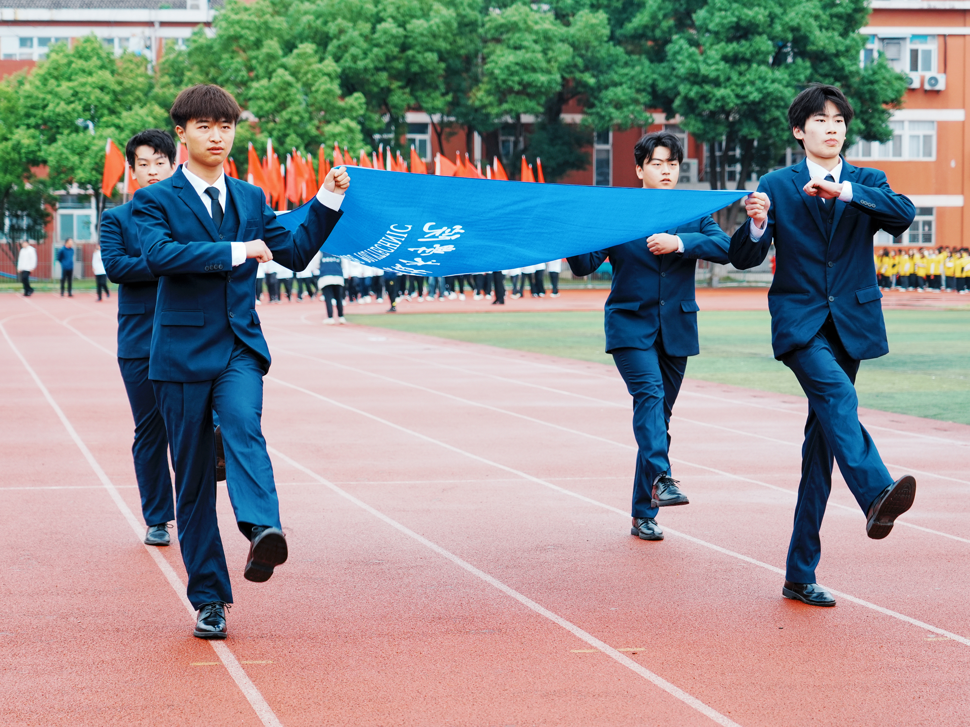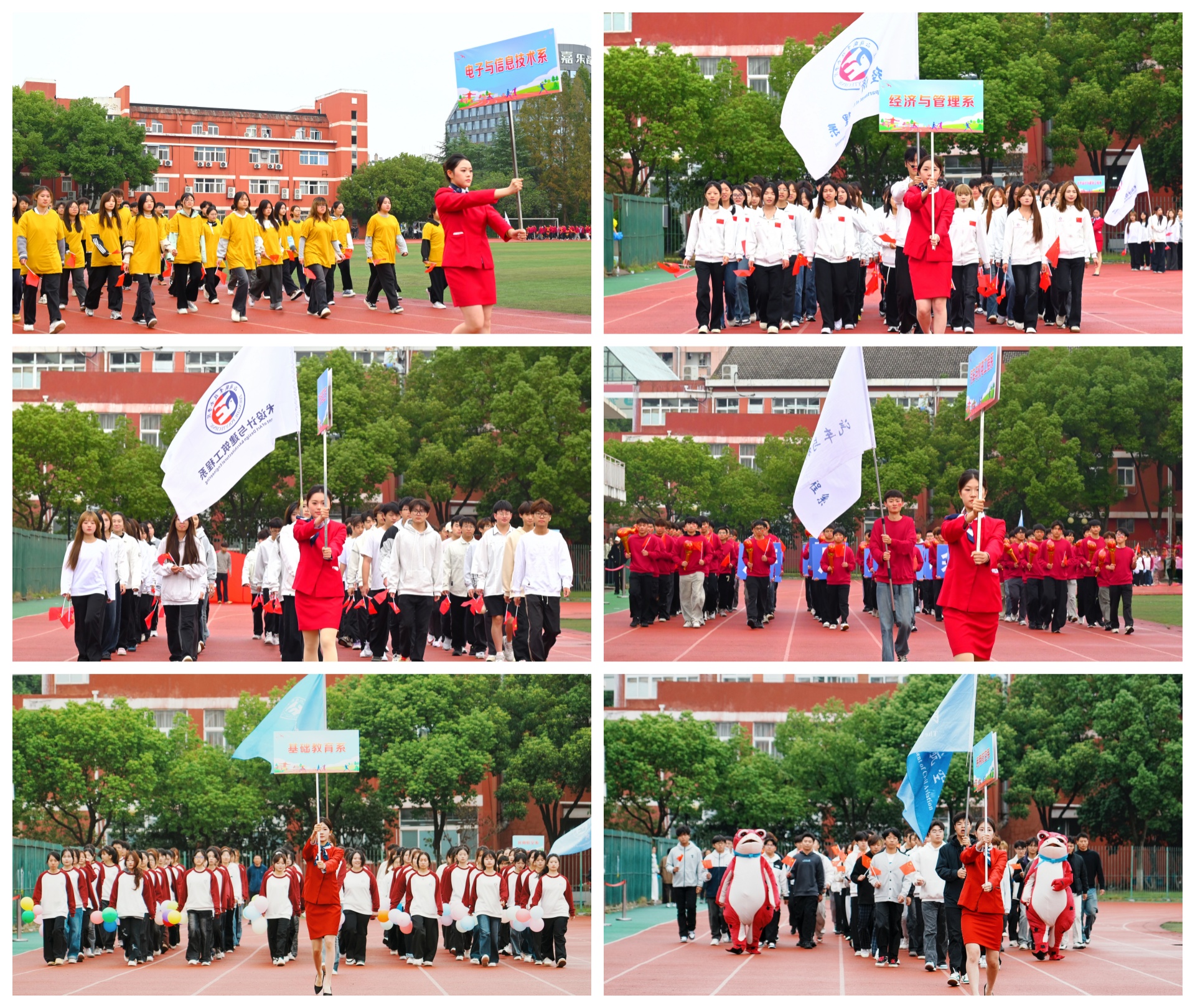 随着激昂的《运动员进行曲》响起,由国旗、校旗与红旗构成的前导队以及各系学生组成的方队,依序步入会场。各系代表方阵士气高昂、口号铿锵,彰显出正德学子积极进取、团结奋进的青春风貌。