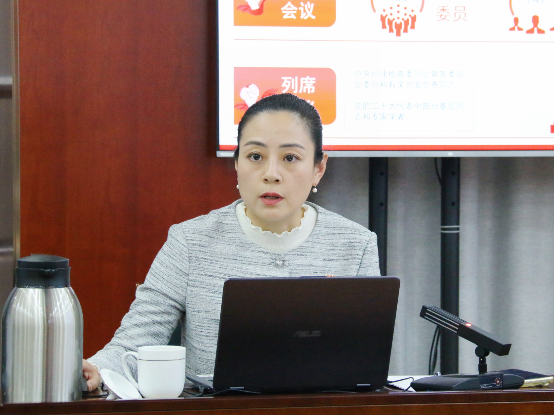 电子与信息技术系党支部书记赵欣围绕本支部“‘四引领强基、四融合赋能’打造院系‘一融双高’发展新机制”获奖案例的创新思路由来、具体做法及实现路径进行了交流发言。党群工作部部长祖国布置了近期党建与宣传思想工作。