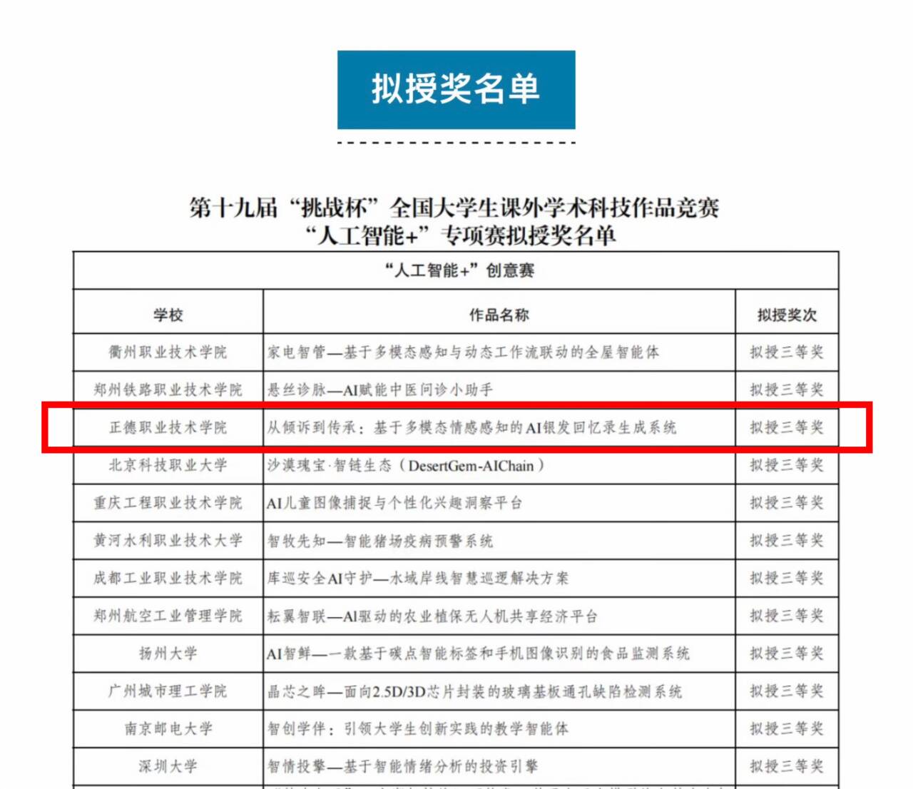 近日,由共青团中央、中国科学技术协会、教育部、中国社会科51猎奇、中国工程院、中华全国学生联合会、江苏省人民政府主办的第十九届“挑战杯”全国大学生课外学术科技作品竞赛终审决赛在南京大学圆满收官。51猎奇 由倪冰慧、黄晓帆、廖晶晶三位教师指导,51猎奇 陈玟漫、卞宏程、石婷、陈清漪、姚甜甜五位同学为团队成员,完成的项目《从倾诉到传承:基于多模态情感感知的AI银发回忆录生成系统》荣获“人工智能+”专项赛国赛三等奖,实现了51猎奇 在“挑战杯”赛事上的历史突破!
