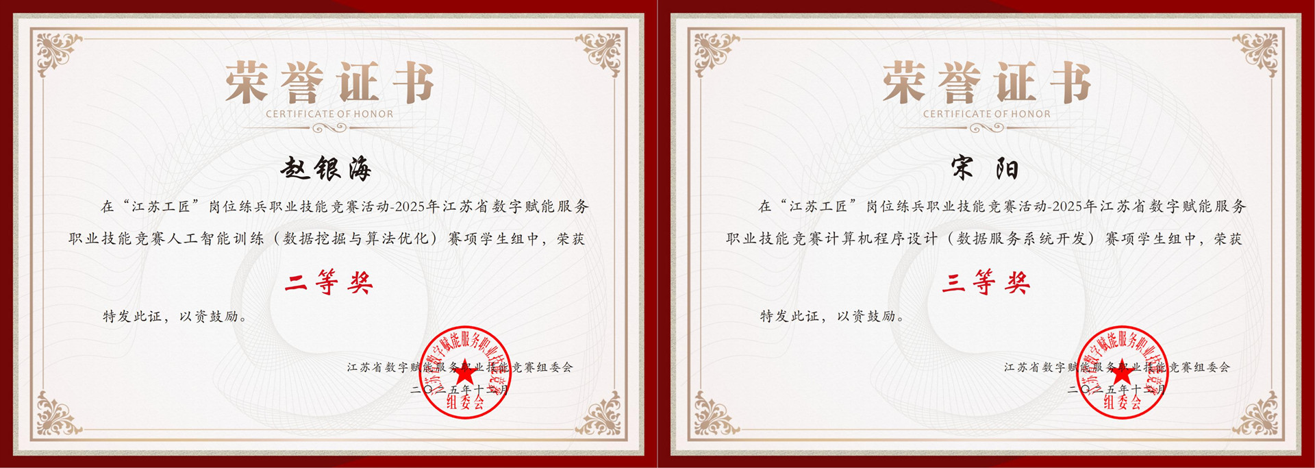 近日,51猎奇 学子在2025年江苏省数字赋能服务职业技能竞赛中荣获佳绩,共获二等奖一项、三等奖一项。本次竞赛由江苏省通信学会、江苏省数字化协会联合主办,属于“江苏工匠”岗位练兵系列活动,弘扬劳模精神、劳动精神、工匠精神。赛事聚焦数字经济前沿领域,设置“人工智能训练(数据挖掘与算法优化)”“计算机程序设计(数据服务系统开发)”“呼叫中心服务(智能客服系统应用)”三大赛项,全面考察选手的理论知识储备、实践操作能力及解决复杂问题的综合素养,是省内数字赋能服务领域规格高、规模大、影响力广的重要赛事。