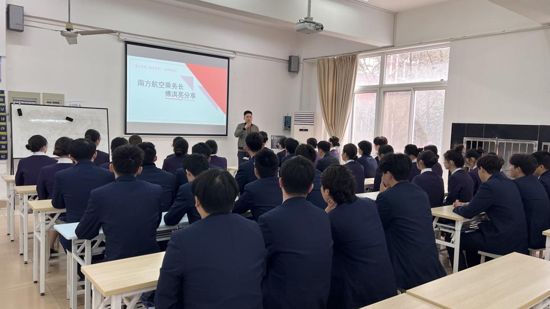 傅洪亮和同学们分享他毕业十年的奋斗故事和心路历程,作为一个拥有八年经验且零投诉的乘务长,始终秉持着严谨态度和无私奉献、创新进取的工作原则,为旅客提供安全高效的出行质量。并告诉同学们航空公司的面试技巧以及注意事项。作为曾经的系学生会主席,傅洪亮希望学弟学妹们能够着眼当下,规划未来,在学校中踏踏实实学好专业知识,才能积累更多的经验,永远相信“厚积薄发”的力量。分享结束后,活动进入现场访谈环节,同学们热情高涨、踊跃提问,傅洪亮学长耐心为学弟学妹答疑解惑。