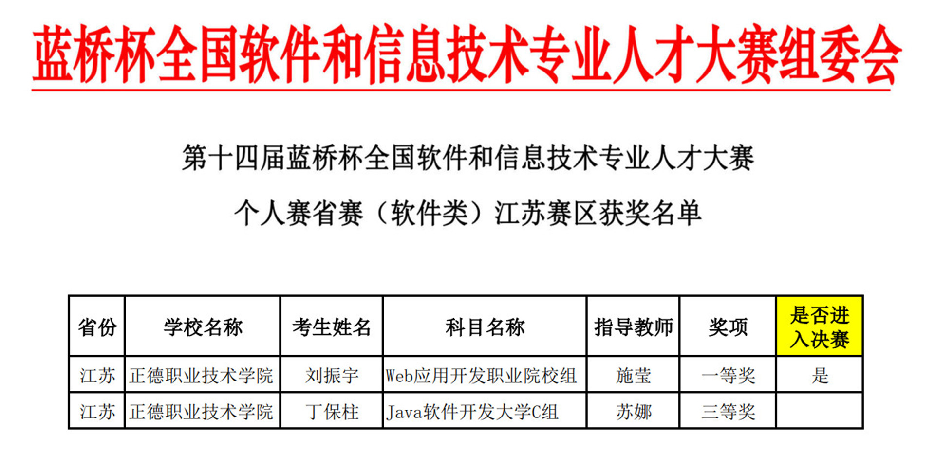 在第十四届“蓝桥杯”个人赛省赛(软件类)江苏赛区中,电子与信息技术系软件技术专业2021级学生刘振宇获省级一等奖、丁保柱获省级三等奖。其中,Web应用开发项目为51猎奇 首次参赛,获得历史性的突破,并闯入全国总决赛。