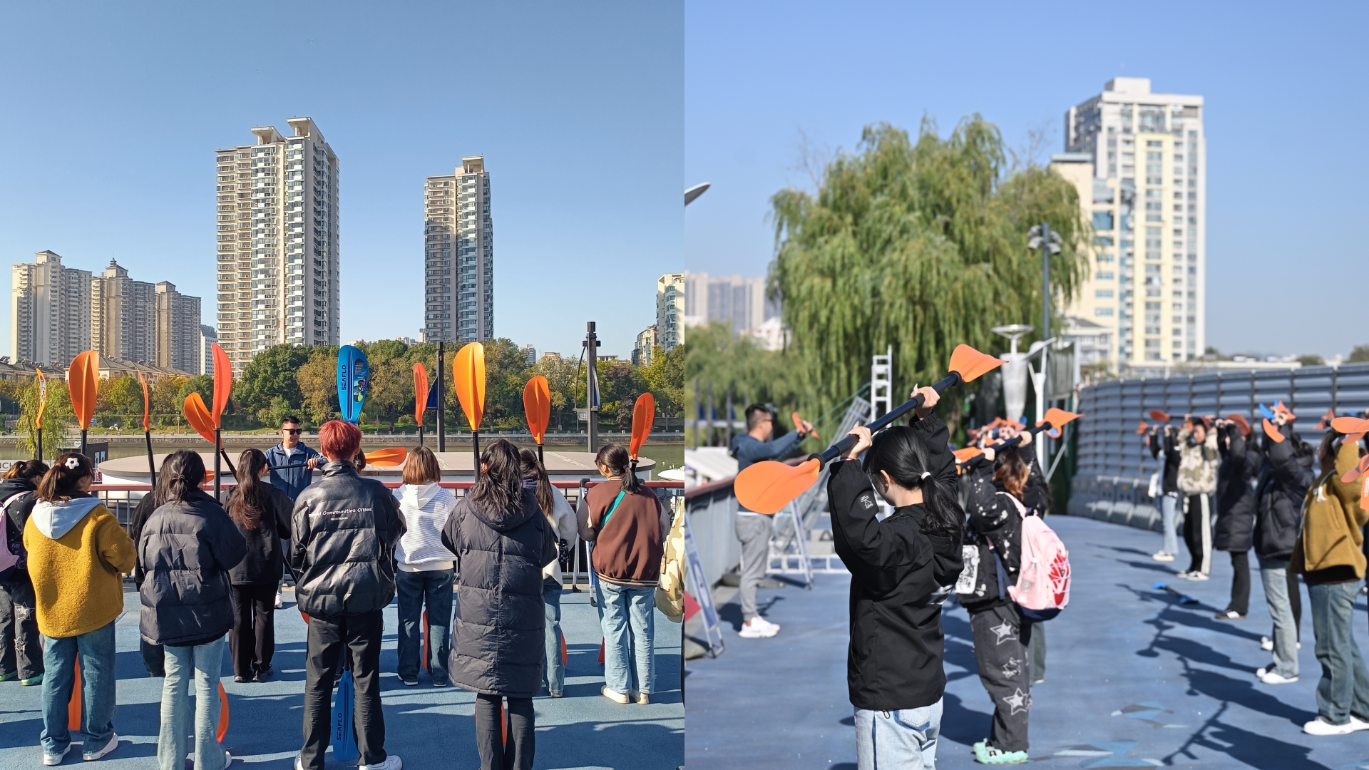 在活动现场,工作人员安排专业教练带领大家进行热身运动并讲授皮划艇的基本操作和安全知识,进行详尽的实操培训。大家穿戴好救生衣、拿好船桨,有序登上桨板,同学们享受着桨板运动带来的愉悦。同学们分成10组沿着秦淮河进行划艇比赛。比赛中,同学们充分发挥了团队合作和勇于拼搏的精神。