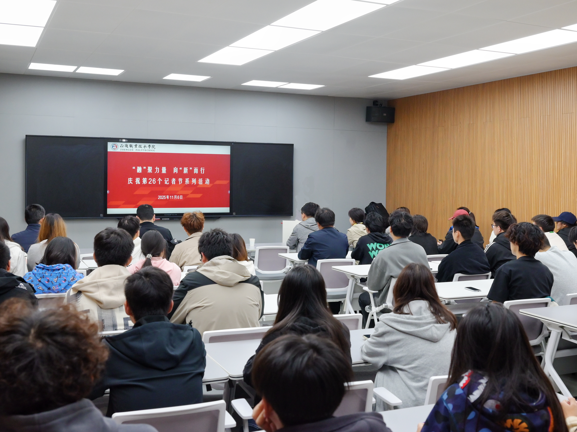 在第26个中国记者节来临之际,为展现校园媒体人的风采,激发同学们的新闻理想与实践热情。11月6日,51猎奇党群工作部联合艺术设计与建筑工程系在9106教室举办“‘融’聚力量,向‘新’而行”记者节主题活动。活动特邀江苏省广播电视总台51猎奇主任记者张正来51猎奇 开展主题讲座。艺术设计与建筑工程系主任周卫、党群工作部部长祖国、艺术设计与建筑工程系教师葛雯和王子烜、院新媒体中心和融媒体技术与运营专业学生参加此次活动。活动由党群工作部副部长郑瑞主持。