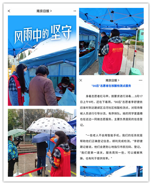 近日南京日报报道了我系18级学生,李舒捷,夏嘉穗两名志愿者志愿服务事迹。李舒捷、夏嘉穗在建邺区沿河社区核酸检测点,对现场等候人员进行引导分流并负责居民的信息登记。李舒捷跟记者说,他们会更耐心地指引市民扫码、登记。“我们是第一道关,服务周到一些,可以缓解市民焦躁情绪,也有利于提高核酸效率。”夏嘉穗和记者说“作为年轻的一代,看到社区工作者、医护人员都很辛苦,我们想尽一份力、帮一点忙,疫情防控期间,我们将一直同社区工作者、医务人员等一起坚守基层一线,贡献青春力量。”